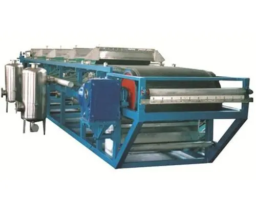 帶式過濾機利用過濾布兩側(cè)的壓力差,將材料中的大部分水分通過過過濾布,流出機體外,材料在過濾室內(nèi)形成過濾餅,達(dá)到過濾目的。過濾過程中濾布兩側(cè)存在較大壓力差,提高過濾速度降低蛋糕含水,采用特制濾布,清晰過濾液,過濾效果比真空過濾機理想得多。